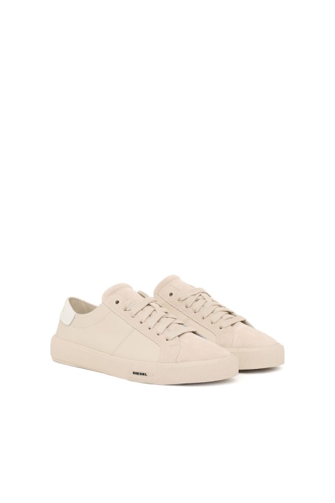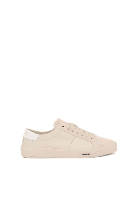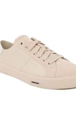 סניקרס מונוכרום עם צללית נמוכה. החלק העליון מעור פרימיום וזמש תואם את הסוליה ומהדק עם שרוכים גולמיים במראה וינטג’. לשונית העקב מוגמרת עם לוגו דיזל מובלט.