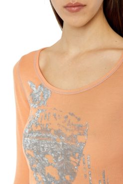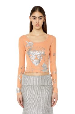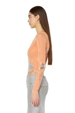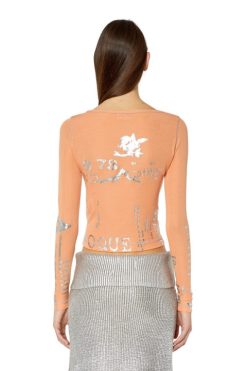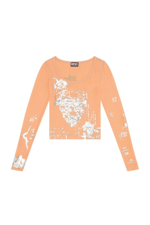חולצת טריקו לנשים עם שרוולים ארוכים עשויה ליוסל מתיחה, מתהדרת בגזרת גזרה גזרה עם צוואר רחב. החזה, הגב והשרוולים מעוטרים בהדפסים מתכתיים מגומיים.