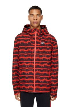 ז’קט קפוצ’ון לגברים של DIESEL SPORT חתוך ממעטפת עמידה במים, בדוגמת מוטיב מונוגרמה ‘D’ חוזר היוצר פסים דו-גווניים מדורגים. הבד, התפרים המלוכדים ורוכסנים חסינים לטפטוף מונעים את הגשם, בעוד שהפתח האחורי מוסת את זרימת האוויר.