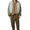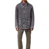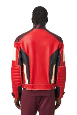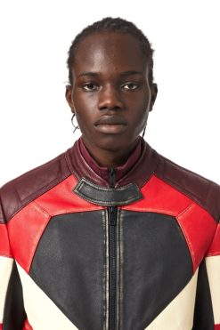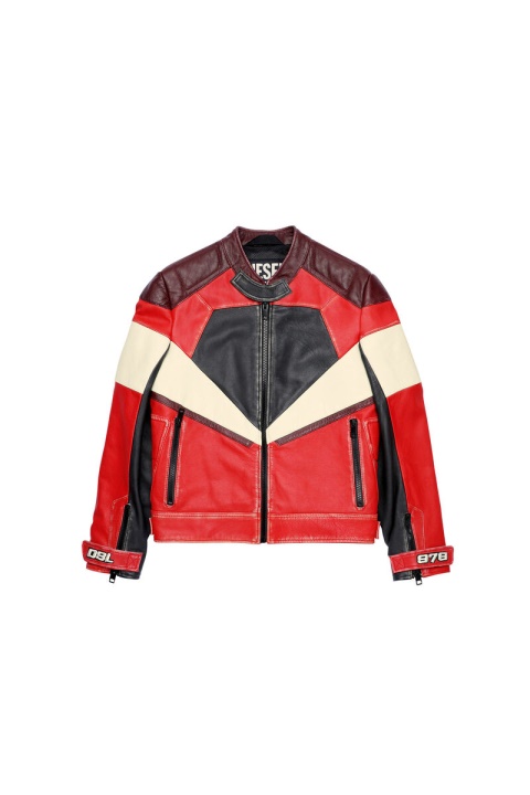 מעיל אופנוע ספורטיבי עשוי לוחות עור מטופל בעיצוב גיאומטרי. חתוך להתאמה רגילה ומרופד חלקית ברשת, הוא כולל צווארון דק וטלאים רקומים על לשוניות השרוול.