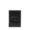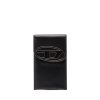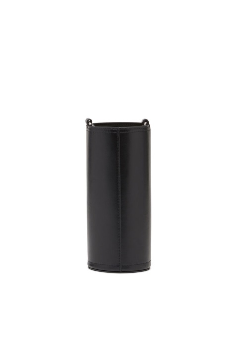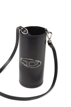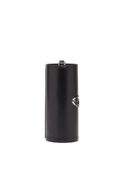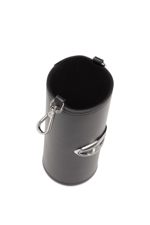מחזיק בקבוקים מעור נאפה שחור, מודגש עם לוח לוגו מתכת אמייל. לאביזר זה יש חלק עליון בגזרה גולמית ורצועה ניתנת להסרה.