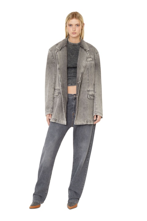 בלייזר בעל שני כפתורים. הוא מותאם בצללית קופסתית עם חזה אחד ומסתיים עם לוגו ד רקום אדום.