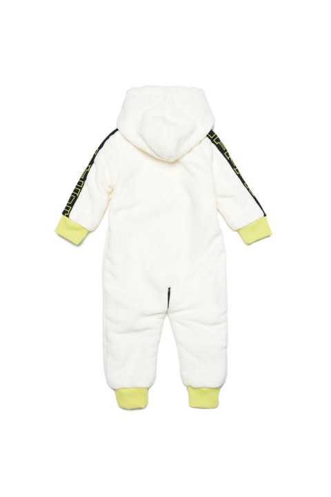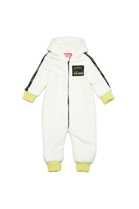 סרבל קפוצ’ון זה בנוי מבד טדי לבן, עם קצוות צלעות ניאון לנוחות. השרוולים כוללים תוספות סרוגות עם לוגו מתאר של דיזל, בעוד שהחזה מכוסה בתיקון ‘דיזל בגדים במפעל’.
