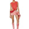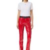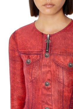 דגם של תערוכת מסלול סתיו 22′, חולצה עם שרוולים ארוכים לנשים בנוי מניילון מתיחה להתאמה דקה לעור שני. הדפס הטרומפ ל’איל הדיגיטלי שלו מחקה ז’קט ג’ינס מטופל בוינטג’. הגרסה האדומה של פריט זה היא מהדורה מוגבלת.