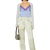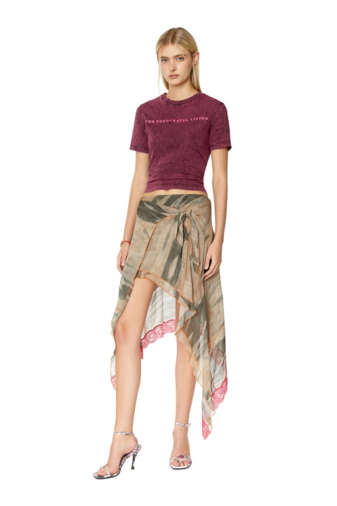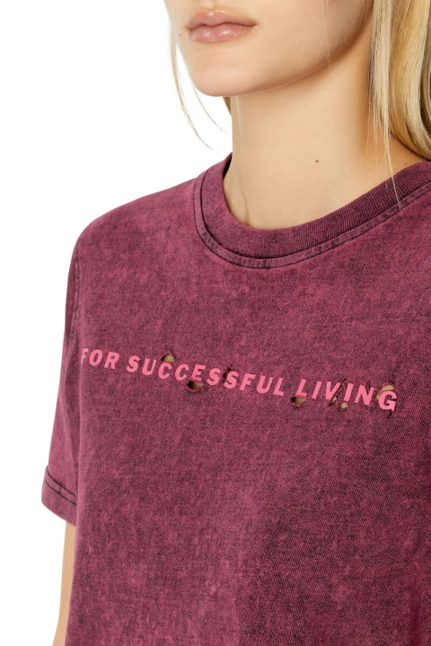 חולצת טי לנשים בגזרה רגילה מג’רזי כותנה צבועה בחוט עם טיפול כביסה וגימור צבוע יתר. הדפסת לוגו על החזה מחוטבת עם חורים חתוכים בלייזר למראה שחוק. לוגו ד סגלגל רקום מעט את המכפלת.