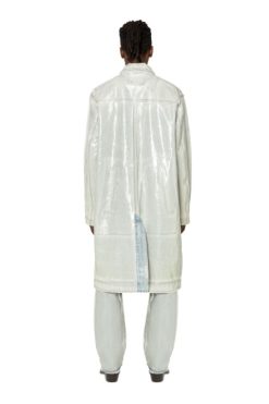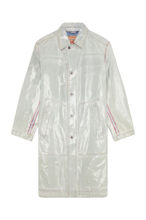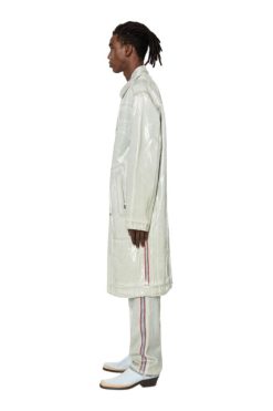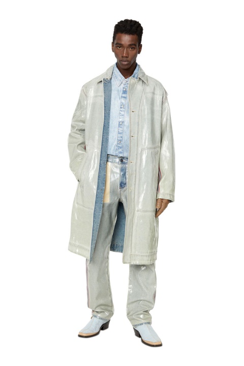 מעיל מכוניות מצופה ג’ינס לגברים מקולקציית FW Runway Show ’22. מכה סביב הברך, לסגנון יש התאמה רגילה וסגירת רוכסן. הכביסה התכלת הזו מעוצבת מג’ינס קבועה ושילוב של טכניקות יצירת מוגברות: טיפולי חום וכביסה מיוחדת אפקט “סרט” מבריק על כל הבגד. תוספות שריגים צבעוניות מנוגדות משלימות את המראה.