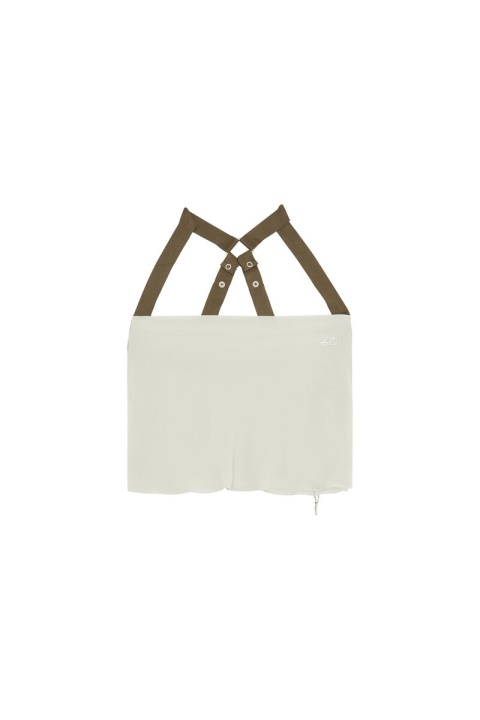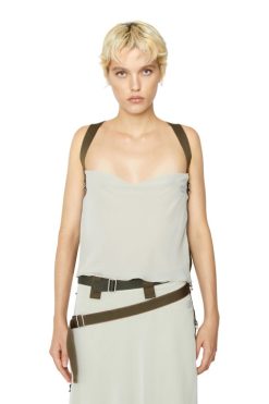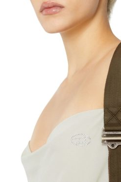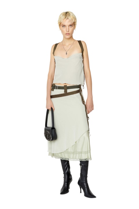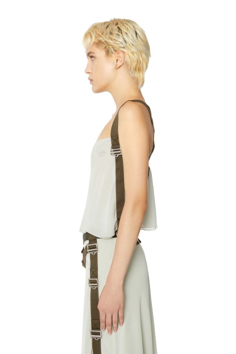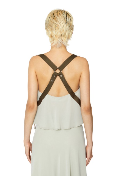 טופ קמי שיפון לנשים עם תחתית ג’רסי נוזלי. הסגנון הקצוץ הזה מוגדר על ידי הקלטות והחומרה נוסח צבאי, עם רצועות מוצלבות וצווארון מעט מכוסה בעדינות המעוטר בלוגו קריסטל ‘סגלגל D’.