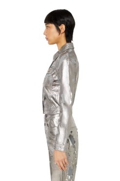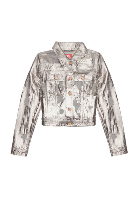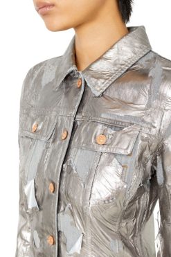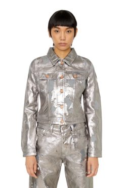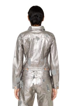 ז’קט משאית לנשים מחויט בגזרה דקה, מעט חתוכה. מעוצב מג’ינס Fix, מכבס נוסח איטליה עם אפקט פילינג ייחודי. זוגיות עוברת שטיפת אבן כדי לקבל גוון אפור בהיר ומכוסה בסרט מיילר ליצירת הגימור הכסוף.