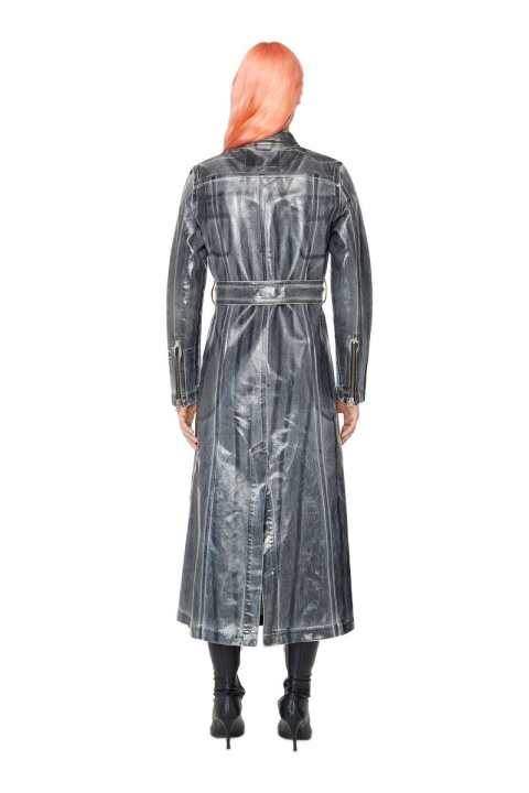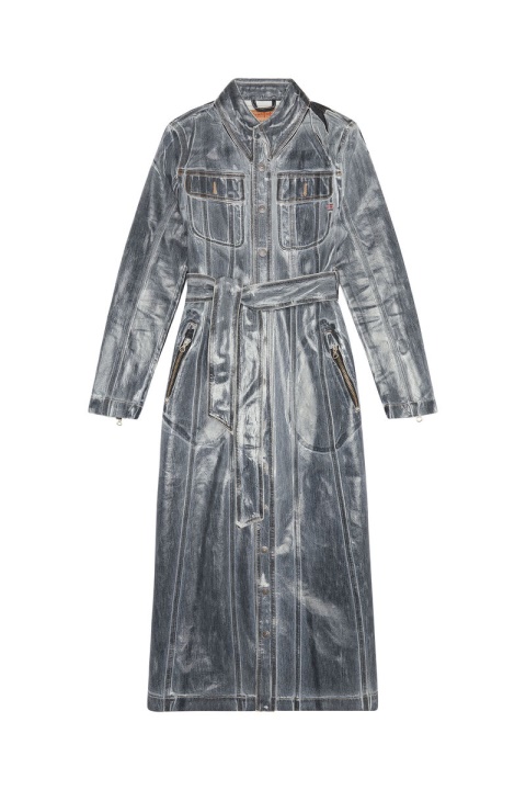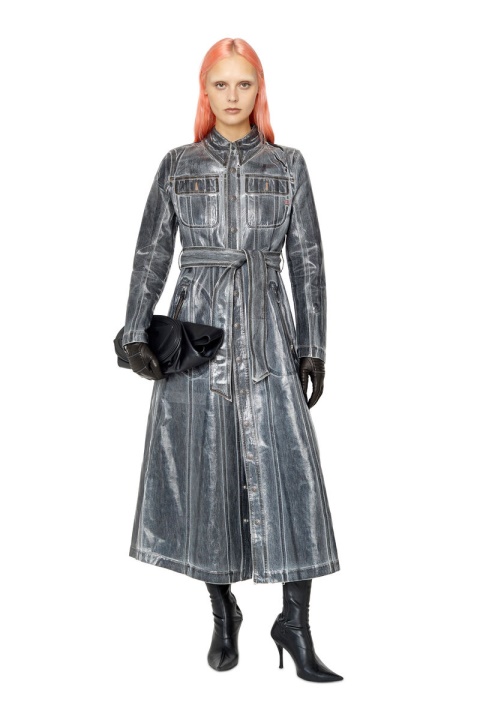 שמלת FW Runway Show Collection ’22 מעוצבת בצללית ארוכה של מעיל משאית. עשוי מג’ינס מצופה, יש לו מוטן חגורה, פרטי רוכסן וכפתורים לאורך החזית. ג’ינס פיקס זה בצבע שחור מאופיין בטכניקות בלעדיות היוצרות את אפקט ה”פילם” המבריק, כולל טיפולי חום וביסה מיוחדת לרכות ונוחות.