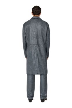 מעיל גברים בכושר רגיל מחויט מעור שחור גמיש עם ציפוי סדוק. הצללית החד-חזה מוגדרת על ידי הצווארון הנשלף המטושטש וגימורים סביב הברכיים.