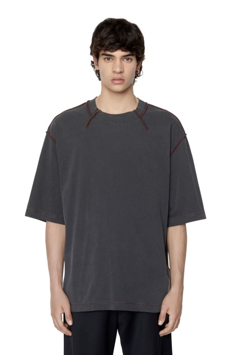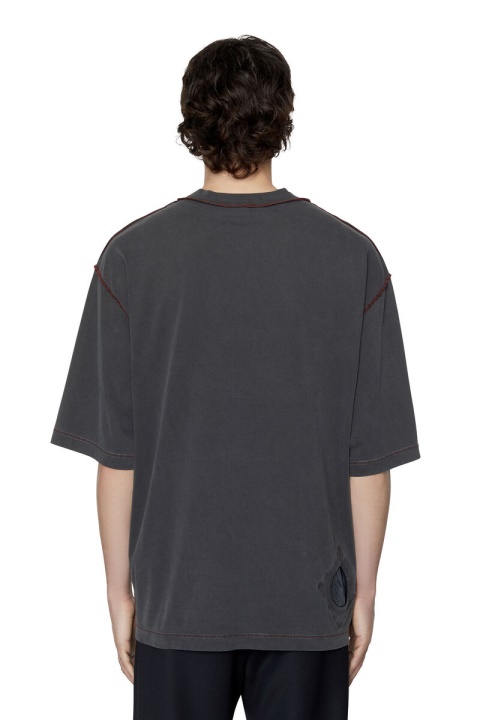 גזרה מכותנה חול וצבועה בפיגמנט,צת טריקוית אוברסייז זו בעל גוון שחור שטוף אם לתפרים אוברלוק מישוש. טלאי ג’ינס מודפס בלייזר מעט את הגב, המוצג בתוך גזרה עגולה.