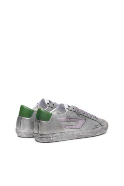 נעלי ספורט לנשים נמוכות אלה גזורות מעור כסוף, מודגשות במיתוג ד לילך ושרוכים תואמים. הנעליים הללו ממוקמות על סוליית גומי מגופרת עם דריכה צבעונית, מטופלות בגימור אפקט מלוכלך למראה חי.