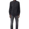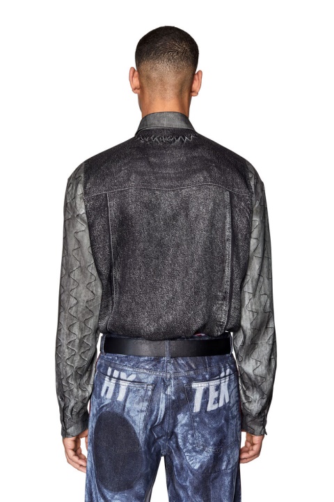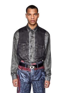 חולצה היא זו חלק מקולקציית המסלול SS22 של דיזל. חתוך בהתאמה רגילה מסאטן מבריק, זה מוגדר על ידי אפקט Trompe L’oeil התפרים, כפתורי השוק וחוליית הג’ינס התועלתנית מודפסים על הבד, ויוצרים אשליה אופטית.