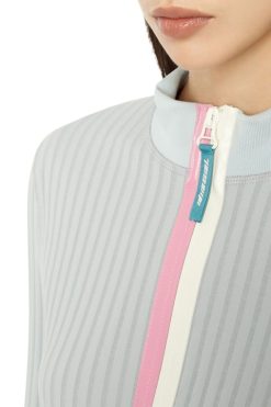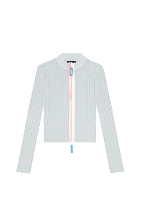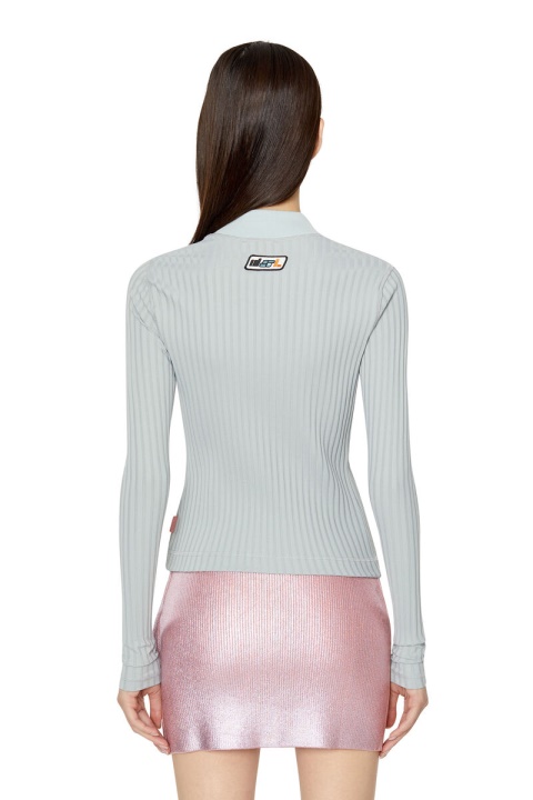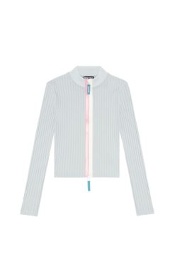 נראה בתצוגת המסלול של סתיו 22′, קרדיגן מתיחה לנשים זה בעל מרקם עדין של סריג צלעות וגזרה מחבקת דמות. חסום בצבע עם סרט מבריק דו-גוני ברוכסן, הוא מעוטר בתיקון DSL רקום בגב.