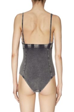 עשוי מכותנה נמתחת, גוף קצר של נשים זה משלב טיפולי כביסה צבועים בבגד וצבוע לבה למראה ג’ינס שחור דהוי. מחוזק עם תפרים ורצועה אלסטית מתחת לחזה, הוא מתהדר בתיקון ‘D’ בחזית.