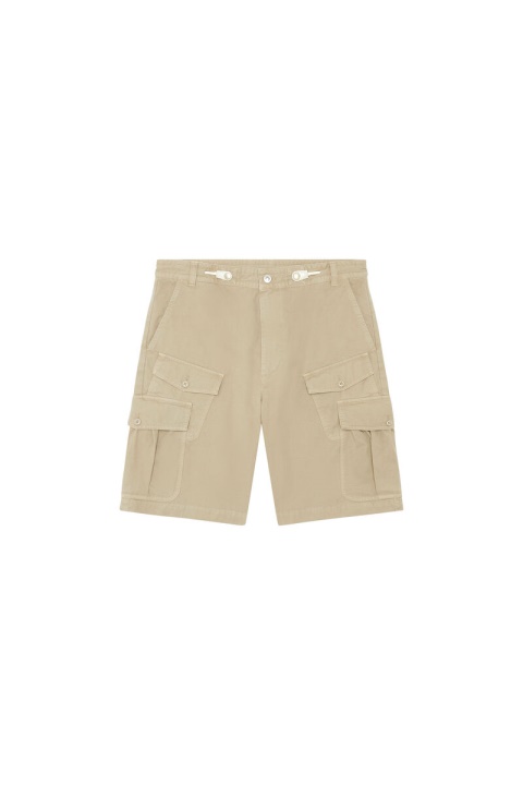 מכנסי קרגו קצרים לגברים בגזרת אריג כותנה כפולה מתוצרת איטלקית. הם צבועים בבגד למראה שטוף, ומעליהם כיסים חופפים בהשראה צבאית. גימור עם שרוכי שרוך בכפתור במותן ולוגו סגלגל רקום ‘D’ מאחור.