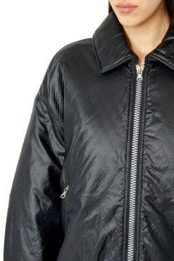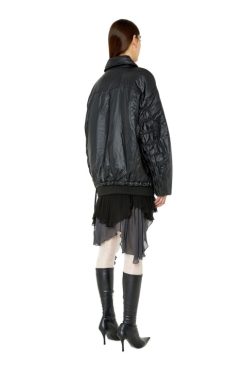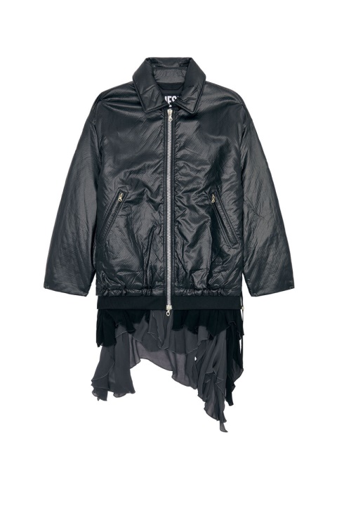ז’קט בומבר לנשים בגודל אוברסייז עם אפקטים אסוף בשרוולים עשוי מבד דו-שכבתי בעל מרקם ומרופד קלות לחמימות. עיטורפון המטפחת המציץ מתוך שולי השרוך המפוצלים יוצר אשליה של חצאית נפרדת.