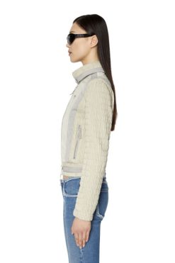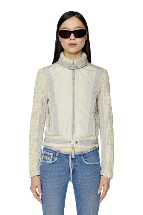 ז’קט נשים קליל עם תחושת רטרו ספורטיבית. העתק של סגנון ארכיוני של שנות ה-90, החלק המותאם הזה עשוי מלוחות חלקים ובעלי מרקם של פוליאסטר ממוחזר דוחה מים ומרופד ברשת. הצווארון נסגר בנקישה ליצירת צווארון משפך.