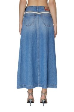 חצאית ג’ינס ארוכה צללית קלאסית בקו והתאמה רגילה. ג’ינס זה כחול מתאפיין בגוון בהיר שטוף אבן, עם תוספות מנוגדות שמגדירות את המבנה הייחודי.