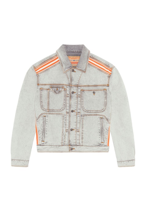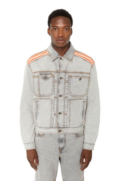 ז’קט משאית לגברים כיסים שימושיים מרובים ופרטים עם תפרים משולשים. מועשר בתוספות סריגים ססגוניות, זוג גינס פיקס זה עובר שטיפת אבן כדי להשיג מראה בלו קלאסי. אפקטי לכלוך וגימור שיש בהיר משלימים את המראה.