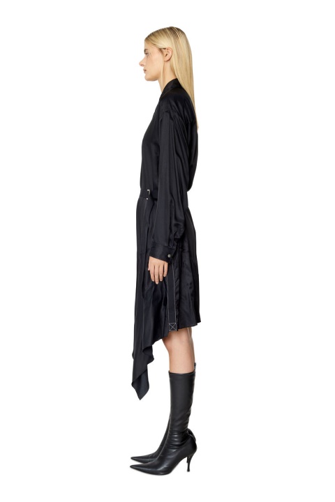 שמלה רפויה בגזרת סאטן ויסקוזה-משי, מתהדרת בשילוב שולי קצף א-סימטרי. חגורת טייפ נוסח צבאי מסדירה את ההתאמה.