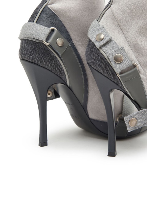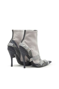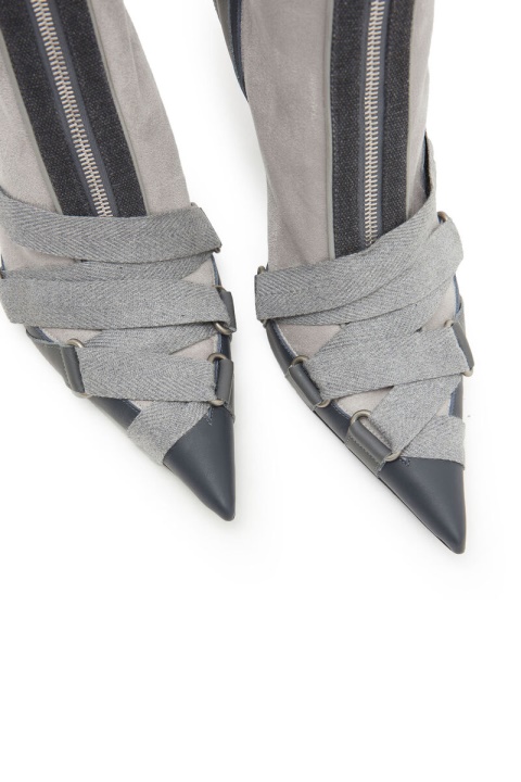 מגפוני הטו לנשים מקולקציית FW Runway Show ’22, בנויים מבד טכני באפקט זמש עם סגירת רוכסן קדמית וצווארון מתיחה. הפרופיל המחודד שלהם מודגש עם כובע אצבע מעור, עטוף ברצועות זיג-זג.