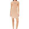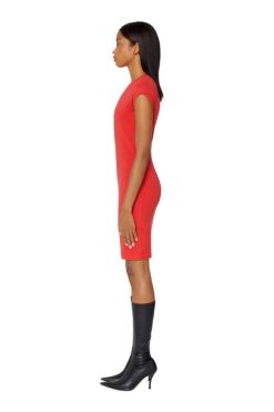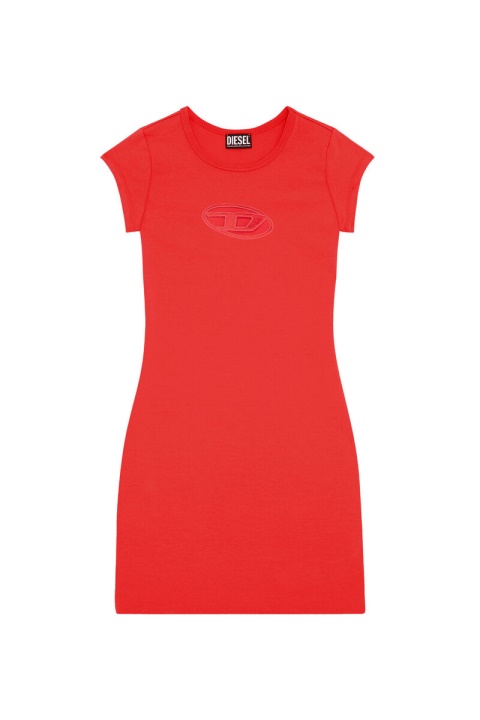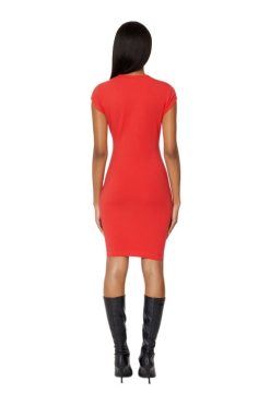 שמלה קצרה לנשים מכותנה נמתחת אדומה, אחידה צללית דקה של חולצת טריקו. הוא מעוצב עם צווארון צוואר ושרוולים קצרים, ומפורט עם לוגו ד חתוך בחזית. הגרסה האדומה של פריט זה היא מהדורה מוגבלת.