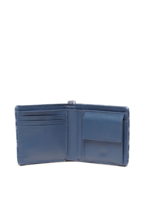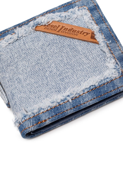 ארנק דו-קיפול לגברים עשוי ג’ינס, רצועה קצרה וכיסמטבעות. העיצוב דמוי המסגרת מפורט עם קצוות משופשפים ולוגו עור המהנה למיתוג הג’ינס של דיזל.