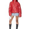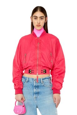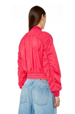 מעיל בומבר בהיר מניילון עם רוכסן חיצוני ארוך ושרוולים מכווצים. סגנון התאמה רגיל לנשים זה כולל מכפלת שרוך אלסטית עם מתכווני עור כפולים