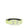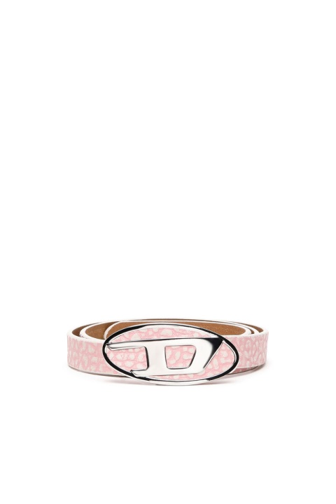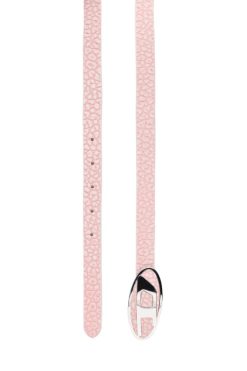 חגורה דקה לנשים זו עשויה מעור ורוד סומק עם אבזם “סגלגל D” ייחודי. העור מוטבע במרקם דמוי בועות מגורען ומצופה לגימור עמיד בפני צעדות.