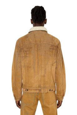 ז’קט משאית גברים בכושר רגיל עשוי מג’ינס קטיפה. עיטור הצווארון והבטנה הרכים, האפרוטים, מציעים בידוד לחורף. הג’ינס המכובס באיטליה עשוי מבד וינטג’ כחול פיקס, שטוף באבן וצבוע נוסף על המידה ליצירת בסיס צבעוני. הדפסת צאן ויישומי טדי בשימוש חוזר אפקט מישוש ייחודי.