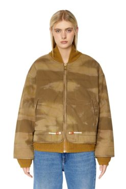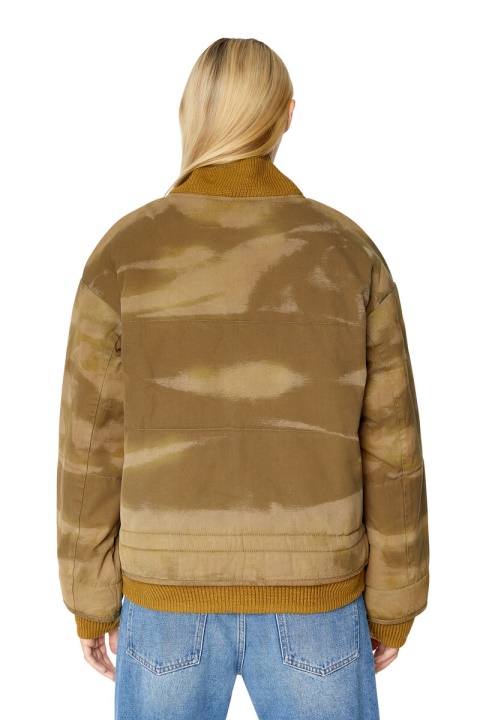 בהשראת עיצובים ארכיוניים, מעיל הפצצה לשני המינים הזה מציג דוגמת הסוואה דהויה בלייזר ועניבה. הוא עשוי מכותנה מיקרו-טוויל בהתאמה רגילה, מרופד לחמימות ומצויד בחוט שרוך ליצירת מכפלת דמוית פפלום.