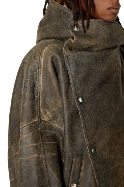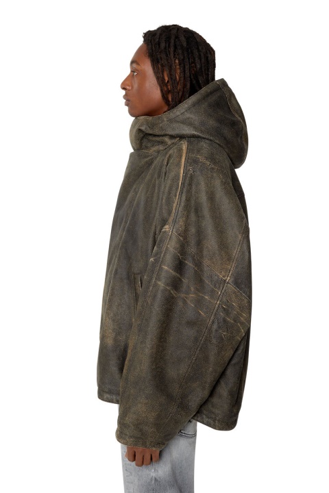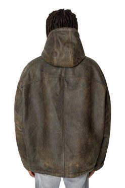 חלק מקולקציית סתיו 22′, ז’קט גברים מרופד זה עשוי מעור סדוק בגוון חום שנפל וטופל בעבודת יד למראה וינטג’ ושחוק. לצללית הנינוחה יש מכסה מנוע מתכוונן ודש נדיב המכסה את הרוכסן הקדמי.