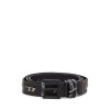 חגורת עור לגברים בעלת עיניים מתכת יציבות ואבזם שחור מט עם רולר לוגו מרקם. הלולאה מסומנת בלוח ‘ד’ מתכתי.