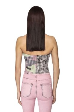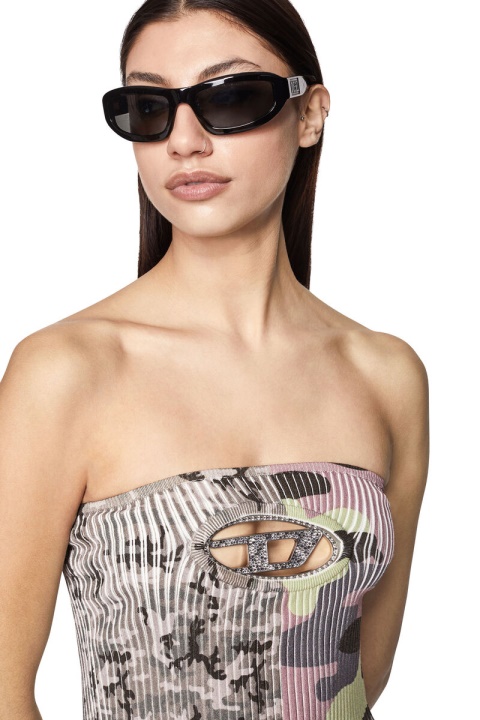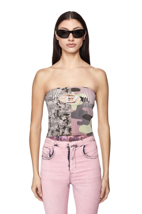 חלק עליון בנדבי ניילון מעורב בגזרה דקיקה מקפסולת תצוגת האופנה, מצופה לייקרה לקומפקטית. חסום צבע עם הדפסה קאמו מעורבים, הוא מוגבה עם לוח מתכת ‘ד’ משובץ באבן יהלומים על החזה לאפקט הצצה.