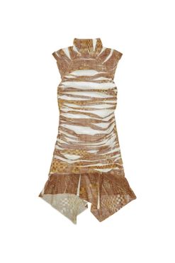 שמלה קצרה בטול סטרץ’ צמוד לגוף, ממוסגרת בצווארון גולף ומכפלת א-סימטרית רזה. לאחר הצורה המלאה של הבגד הזה, הבגד הזה מודפס מכל עבר, ויוצרים ייחודיים בדוגמת ההסוואה המפוקסלת.