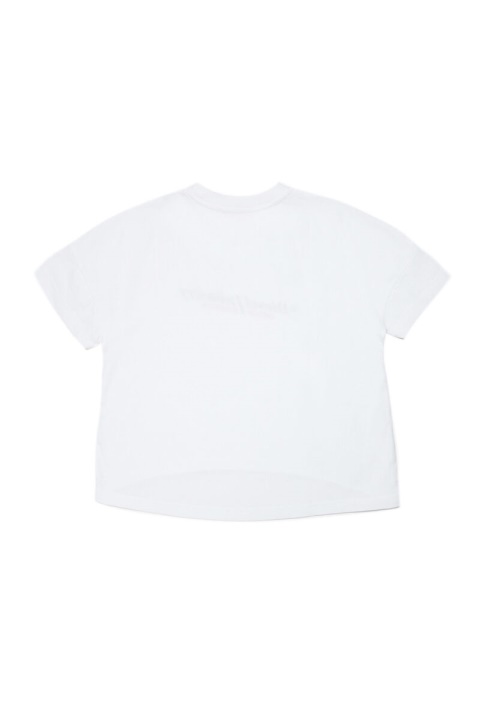 חולצת הטריקו לילדות היא גזרה נוסח Mini Me מכותנה ג’רזי בצללית נינוחה. החלק הקדמי כולל הדפסה לוגו מודגש של ‘דיזל תעשיה, חטיבת ג’ינס’ בגווני אדום וכחול.
