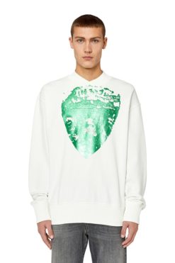 סווטשירט כותנה משוחרר לגברים זה מעודכן עם צוואר מוצלב. החזה מתהדר בהדפסה של מגן דיזל הרוס, מוגבה עם נייר כסף סדוק למעלה.