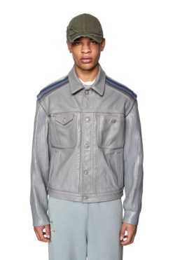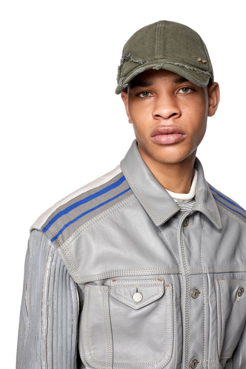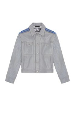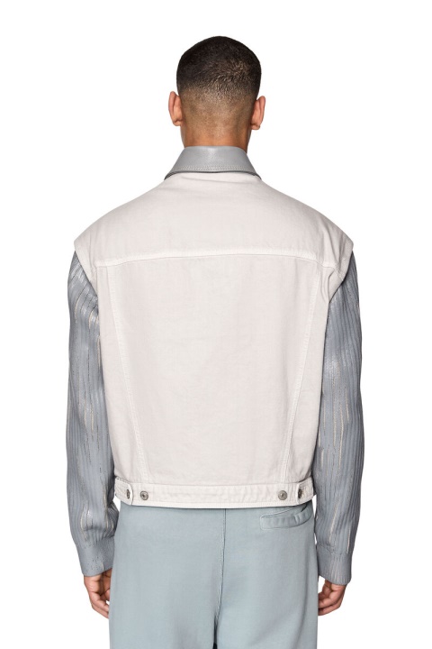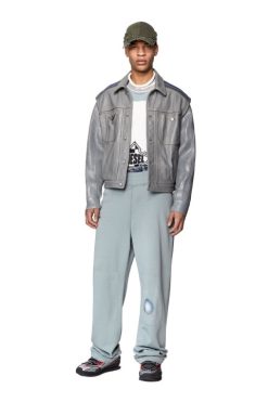 ז’קט קולקציית מסלול אביב 22′ זה הוא סגנון טלאים וינטג’ השואב מהארכיונים של מירוצים ושל דיזל. גזרה בגזרה רגילה ומרופדת קלות, יש לו חזית עור, גב ג’ינס ושרוולים סרוגים בגימור עם הדפסה על הכל. רצועות כתפיים מפוספסות מוסיפות מגע ספורטיבי.