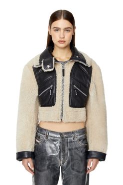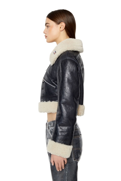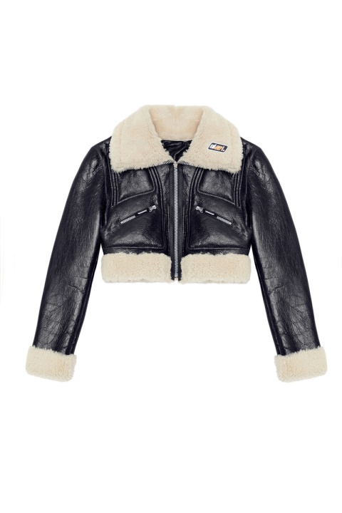 ז’קט שרלינג לנשים קולקציית סתיו/חורף 2022. עיצוב בלוק צבע הפיך, הוא עובר בין עור סדוק מבריק וצד קטיפה עם לוחות עור מחומרים. הצללית הקצוצה כוללת מלא חפתים מתקפלים וצווארון שרוכסן לצוואר גבוה.