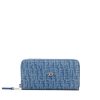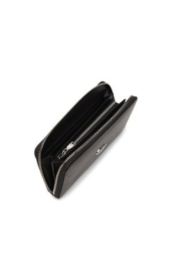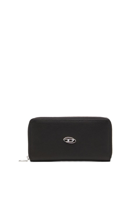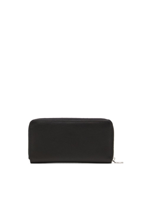 ארנק נשים ארוך עם רוכסן מעור מגורען, מעוטר בחזית שלט לוגו כסוף.