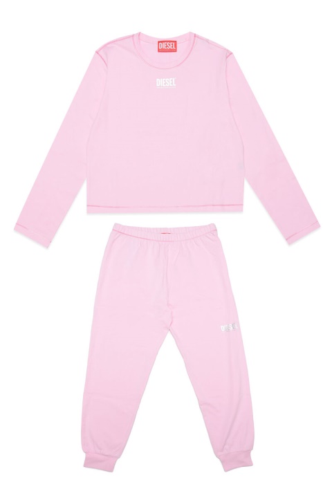 סט פיג’מות כותנה נמתח לילדות, מרכיב חלק עליון עם שרוולים ארוכים ומכנסיים. שני הפריטים ממותגים עם לוגו כסף של Diesel For Successful Living ומודגשים עם תפרים ניגודיים. שלם עם תיק שרוך תואם.