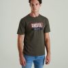 חולצת טריקו ג’רזי מכותנה לגברים עם יצירות אמנות מודפסות בדיו דיזל קלאסיות שלנו ותווית דגל ארוגה ליד המכפלת.