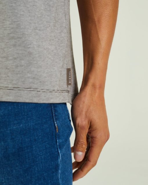 חולצת טריקו עם פסים מכותנה אורגנית לגברים. לוגו פרימיום דיזל רקום על החזה. שלב עם זוג מכנסי הג’ינס המכובסים הכהים שלנו למראה קז’ואל חכם.