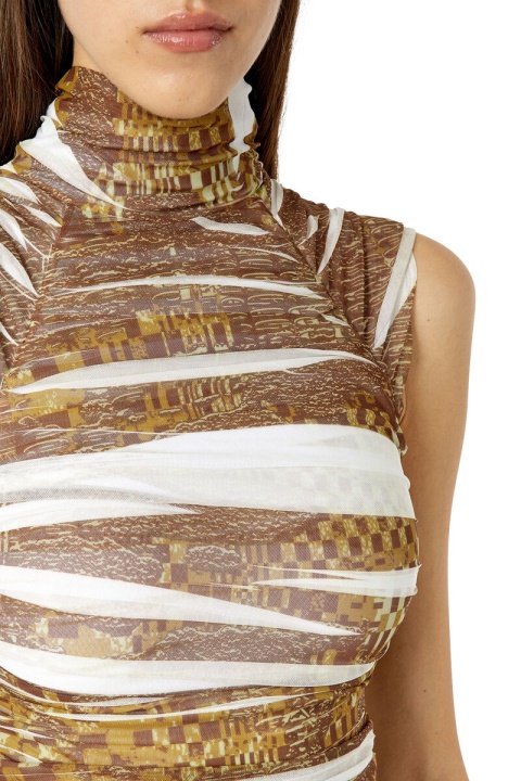 שמלה קצרה בטול סטרץ’ צמוד לגוף, ממוסגרת בצווארון גולף ומכפלת א-סימטרית רזה. לאחר הצורה המלאה של הבגד הזה, הבגד הזה מודפס מכל עבר, ויוצרים ייחודיים בדוגמת ההסוואה המפוקסלת.