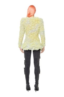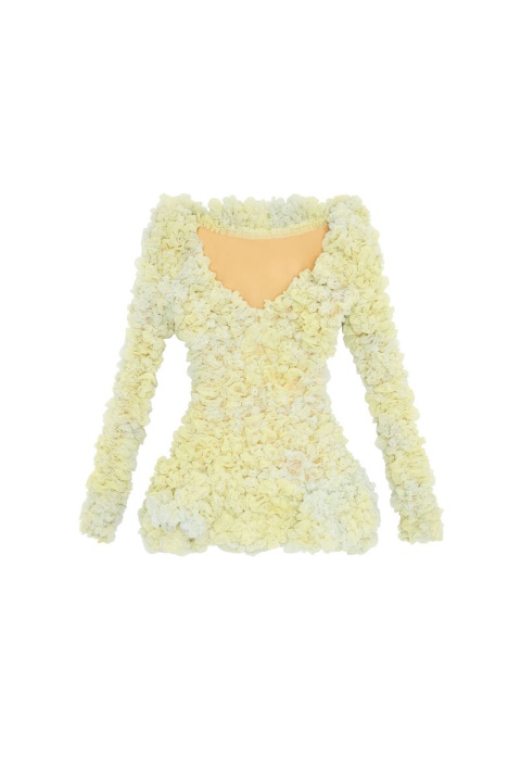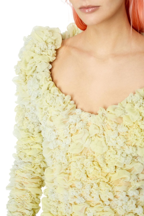 שמלת סתיו/חורף 2022 זו מציגה מרקם חלוקה תלת מימד אומנותי עם אפקט שקוף למחצה. הצללית הקצרה כוללת צווארון ונפח נוסף על הכתפיים.