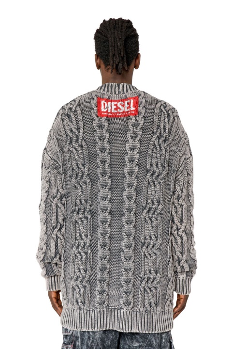 שילוב של סריג הפוך וכבלים עבים, קרדיגן כותנה לגברים זה בעל התאמה אוברסייז וכפתורי קרן מזויפים. הדפס לוגו האדום בגב מבצבץ על רקע הגוון האפור הדהוי.
