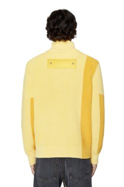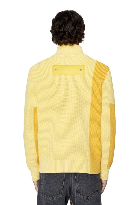 קרדיגן בעל צווארון גבוה עם צלעות סרוג משילוב כותנה, מתהדר בלוקים אינטרסיה בגוונים גוונים. סגנון גברים זה מטופל למראה דהוי וגימור עם ניילון פרטי ותג קנבס מכותנה אורגנית על המכפלת.