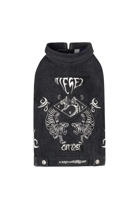 מעוצב מג’ינס דיזל ייחודי, ז’קט הכלב הזה רקום עם גרפיקת פאנק בעלת ניגודיות גבוהה, עם הדפסים וטלאים של חיות פרא המשלימות את המראה.