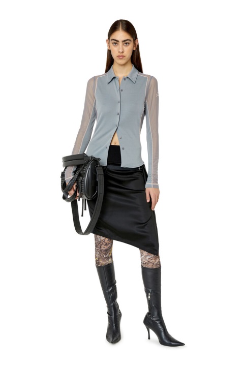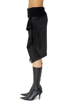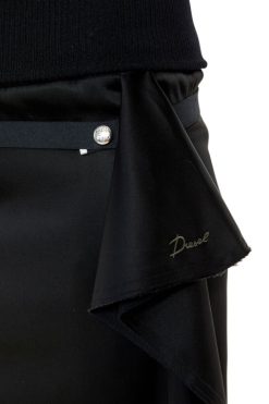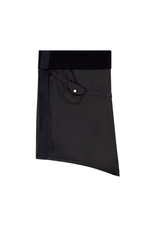 חצאית בגזרה רגילה מסאטן סופר-סטרץ’, מתהדרת בצללית א-סימטרית עם דיטיילים מרופדים ומותניים עם צלעות. גימור עם חגורת סרט ניתנת להסרה עם כיס דש קטן.